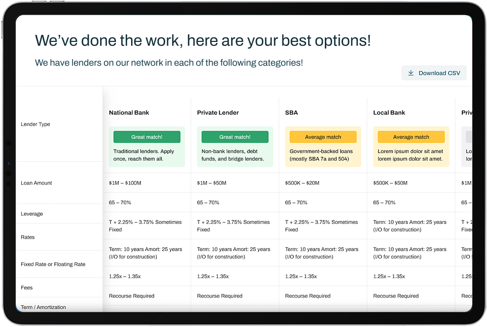 Compare competitive offers with standardized term sheets, side-by-side. Guided by our team of experts.